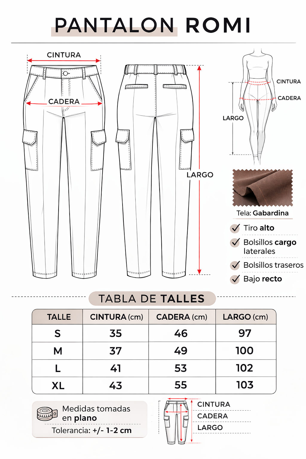 El Pantalón Cargo Romi es firme pero flexible, gracias a su confección en tela de sastrería, que le aporta estructura sin perder comodidad. ? Detalles de bolsillos estratégicos, que le dan ese aire relajado y funcional, sin dejar de ser un básico con estilo.